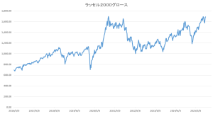 2025年12年5日の米国小型成長株インデックス(Russell 2000 Growth)は、1688.48で終わりました。一週間前に比べて+14.32(+0.86%)と小幅続伸しました。