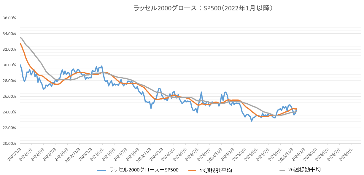 この数週間、「金利低下の期待の鈍化」「AI 銘柄のバリュエーションに対する懸念」という2つの売り材料により、「リスクオフ」→「相対的に経営力の弱い米国小型成長株はさらに売り込まれる」という流れでした。しかし、この流れが少し改善し、上記の比率も24%半ばまで改善しました。